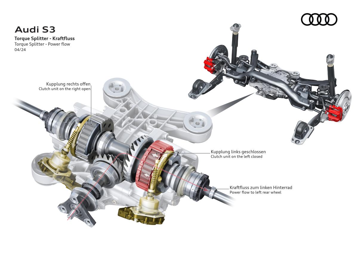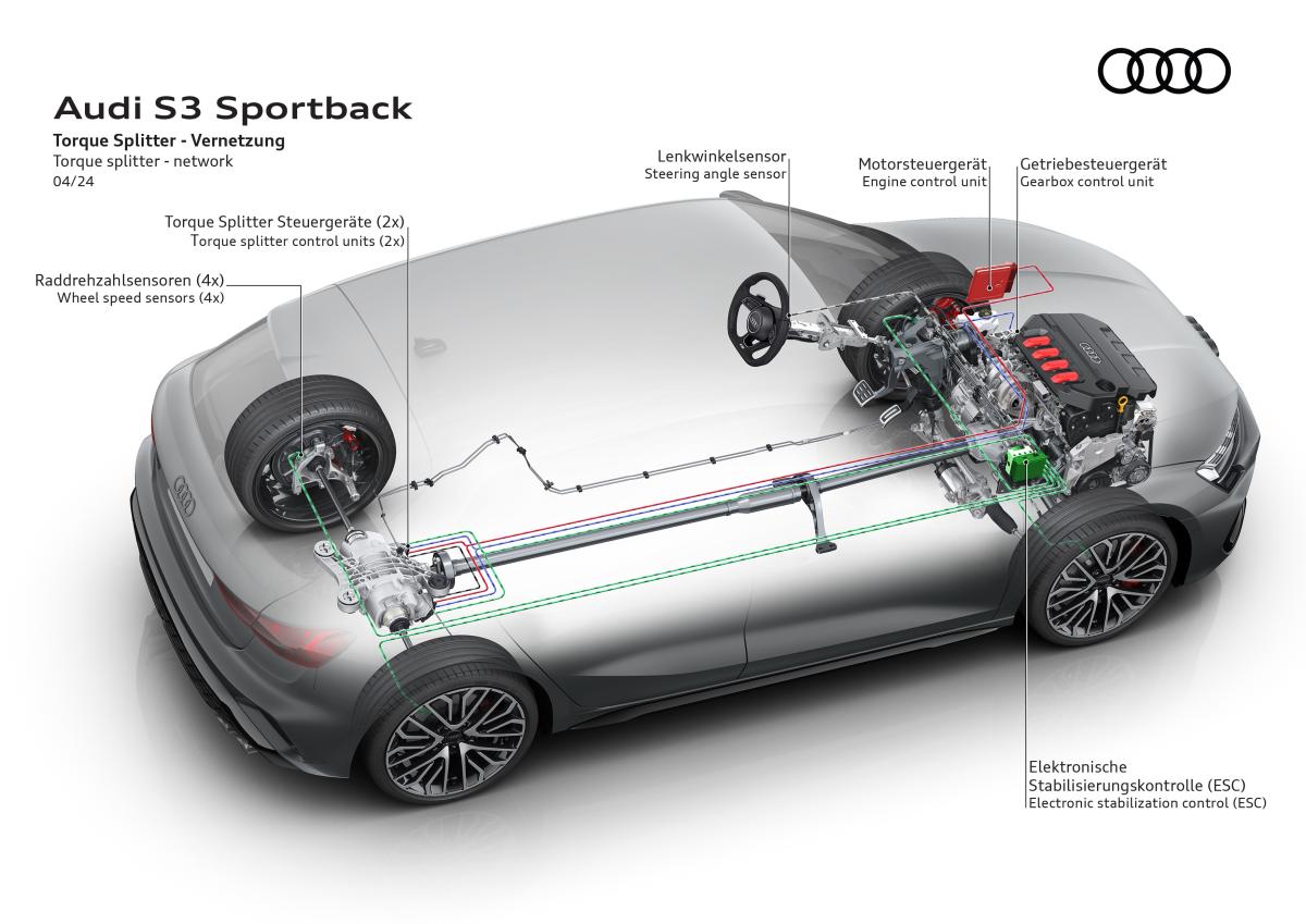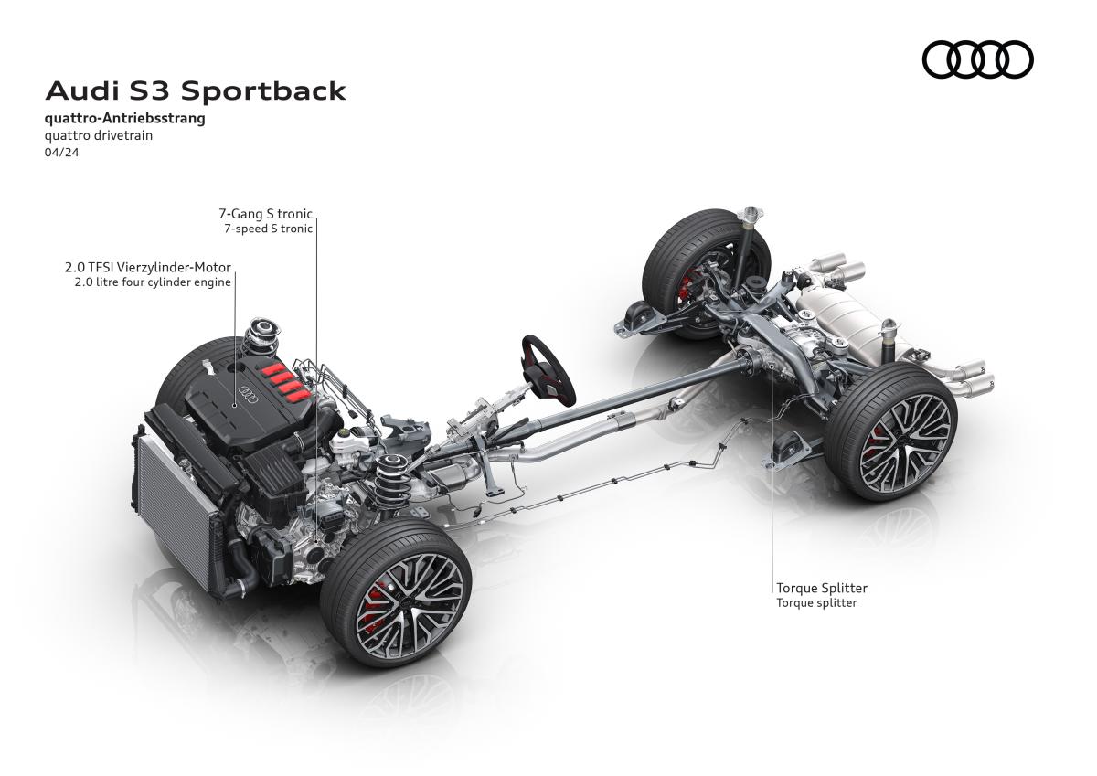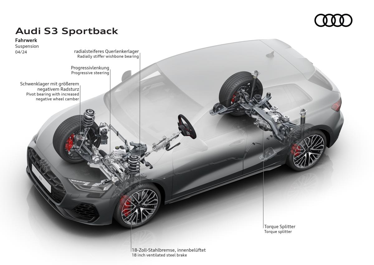 L’un des apports majeurs de la S3 8Y réside dans son châssis profondément retravaillé, encore affiné sur la phase 2. La transmission intégrale quattro utilise un répartiteur de couple actif sur l’essieu arrière, capable de moduler précisément le couple entre les roues. Ce dispositif améliore considérablement l’agilité en virage et réduit le sous-virage traditionnellement associé aux transmissions intégrales.