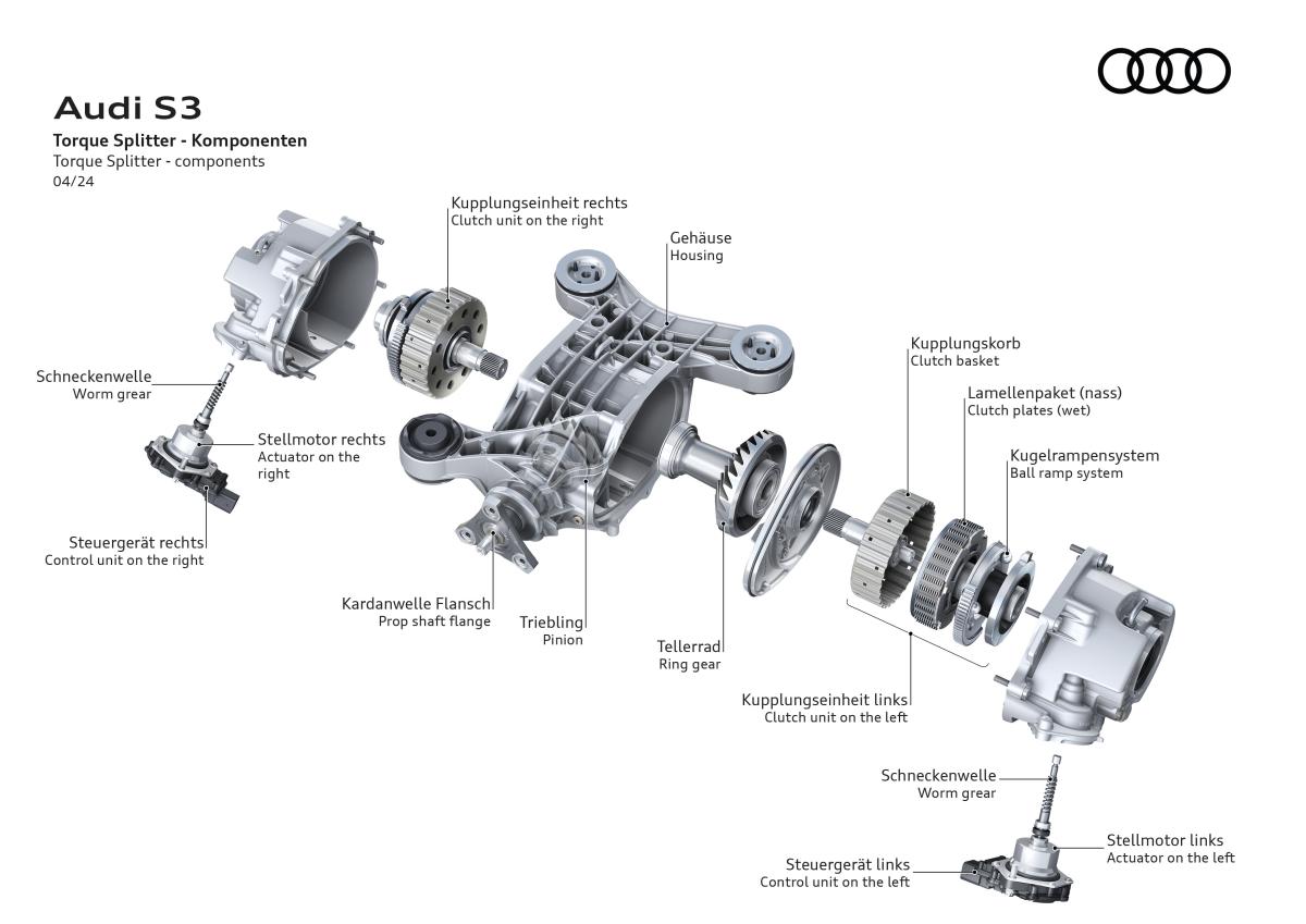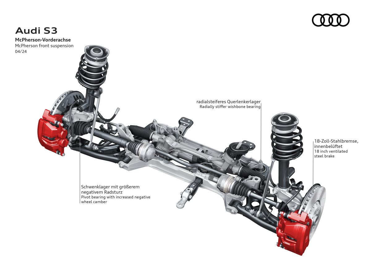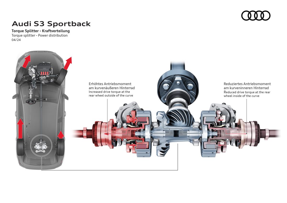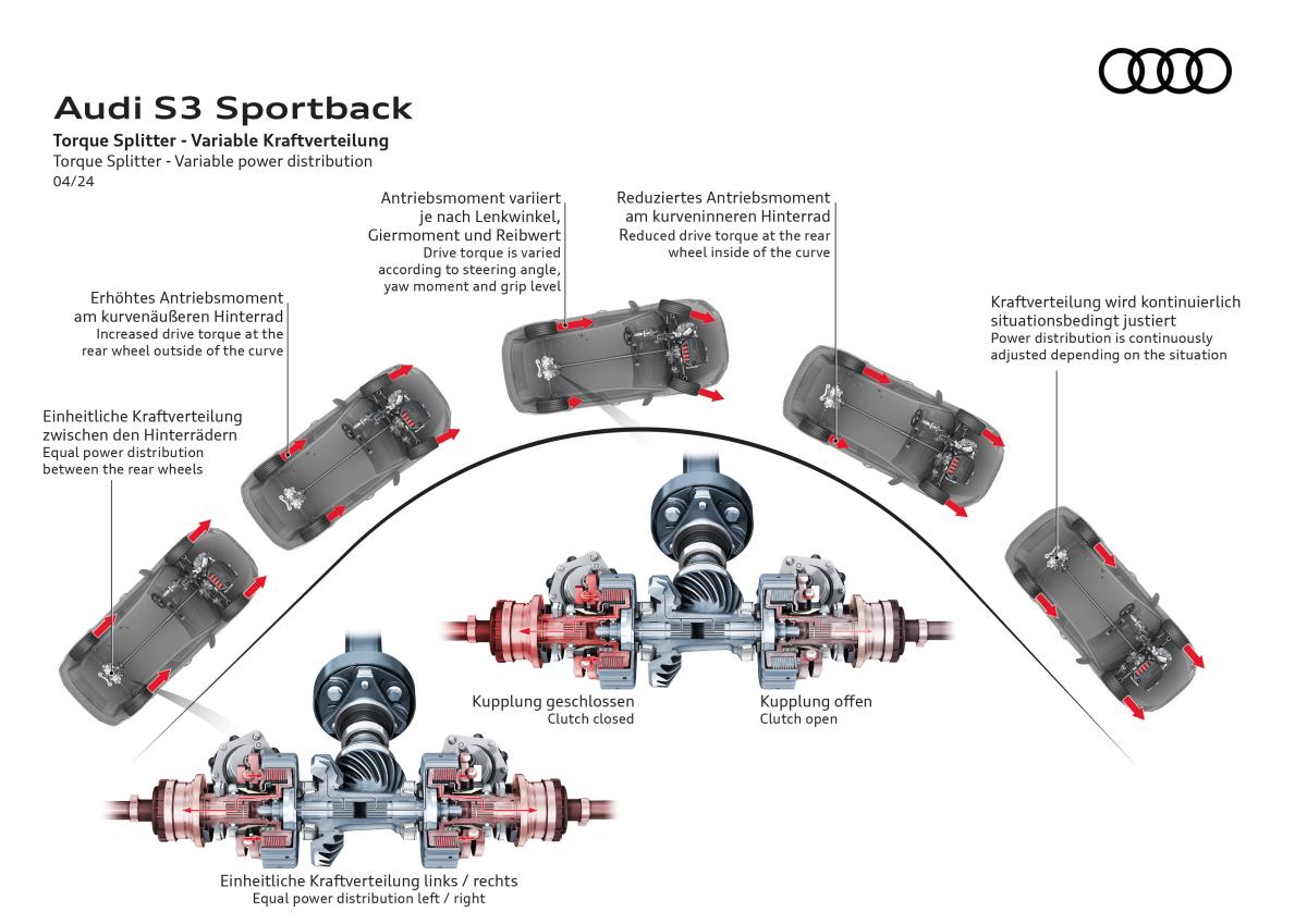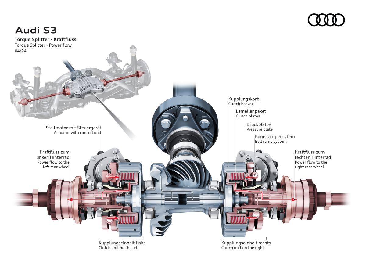 L’un des apports majeurs de la S3 8Y réside dans son châssis profondément retravaillé, encore affiné sur la phase 2. La transmission intégrale quattro utilise un répartiteur de couple actif sur l’essieu arrière, capable de moduler précisément le couple entre les roues. Ce dispositif améliore considérablement l’agilité en virage et réduit le sous-virage traditionnellement associé aux transmissions intégrales.